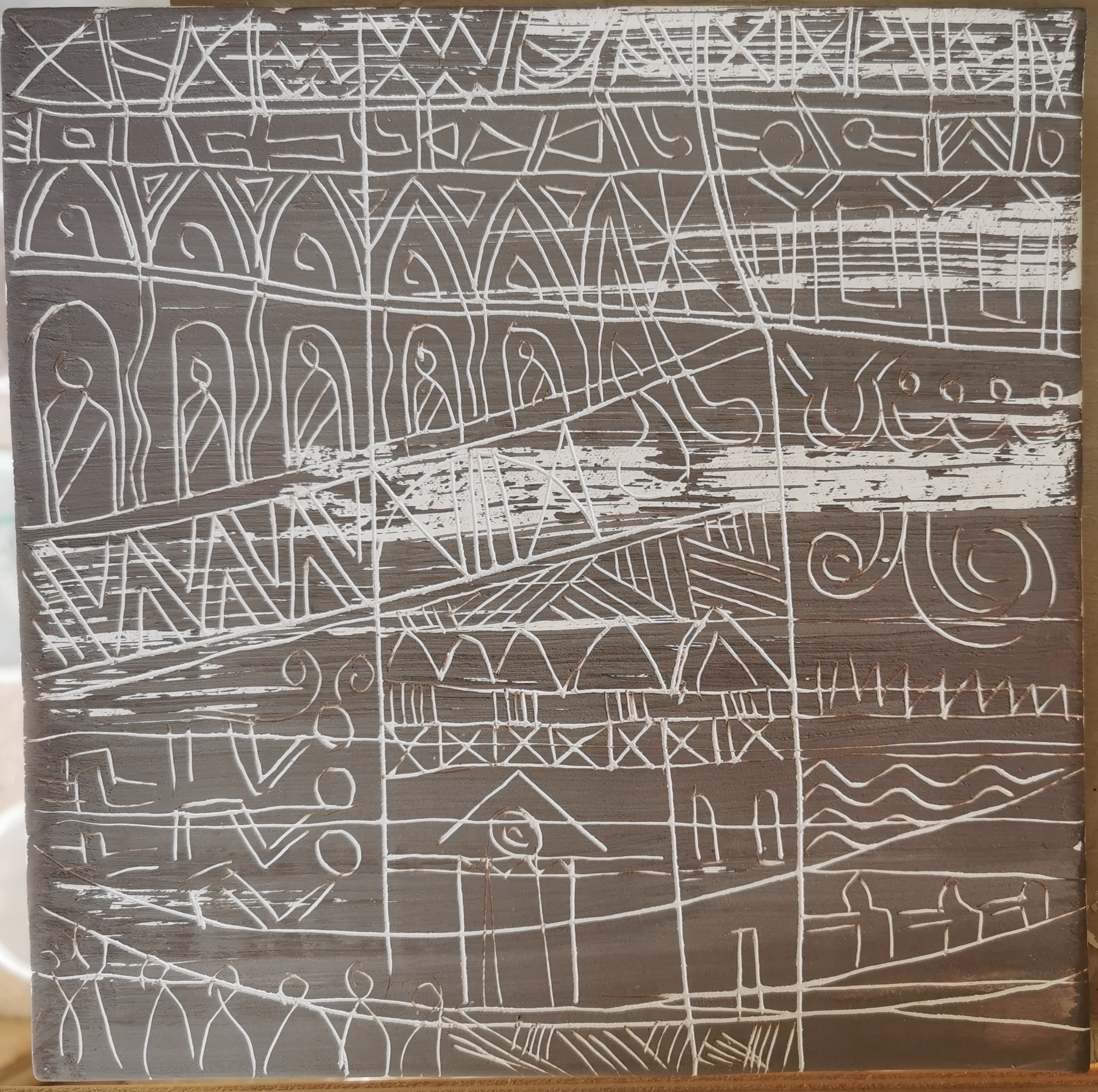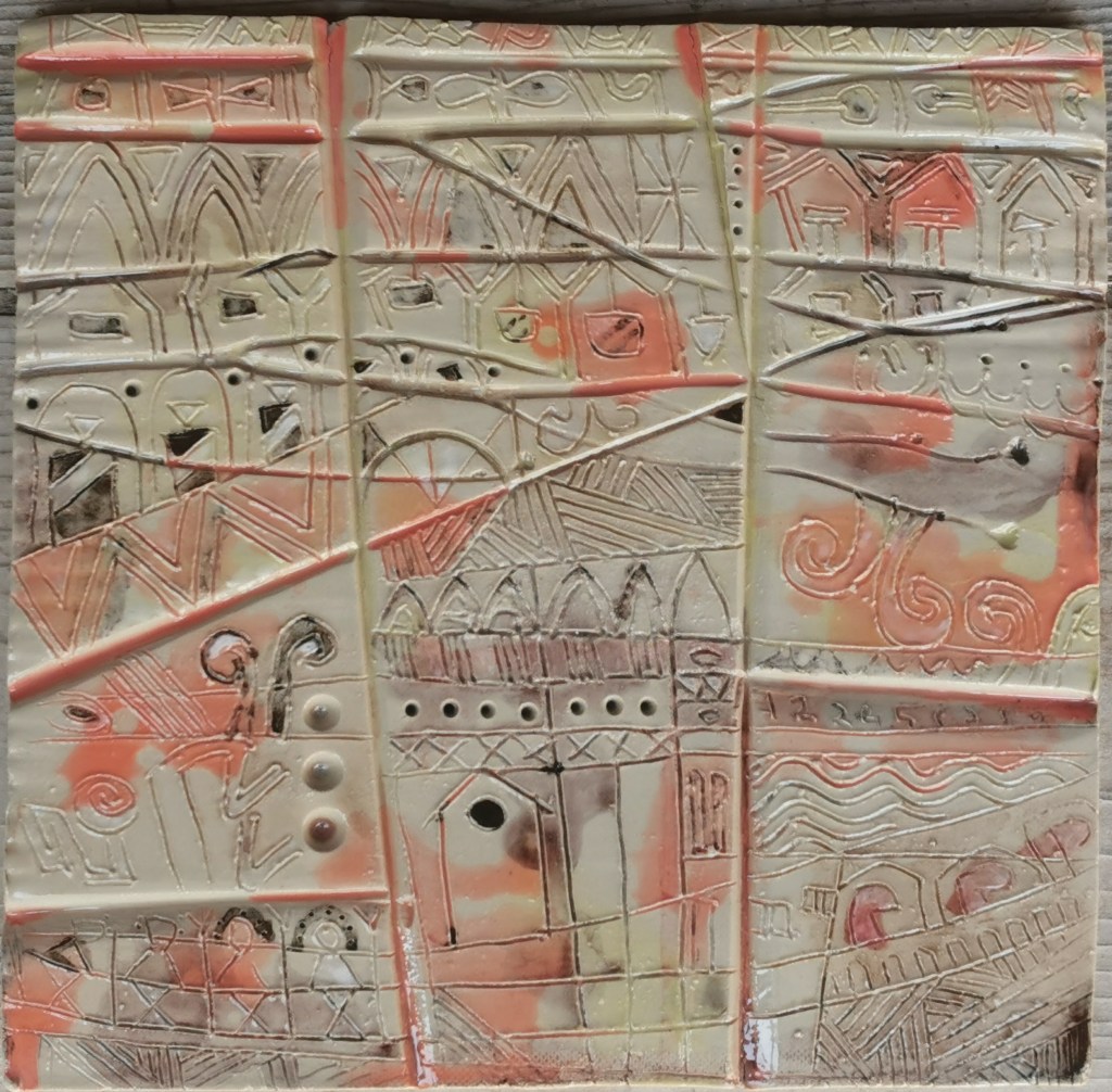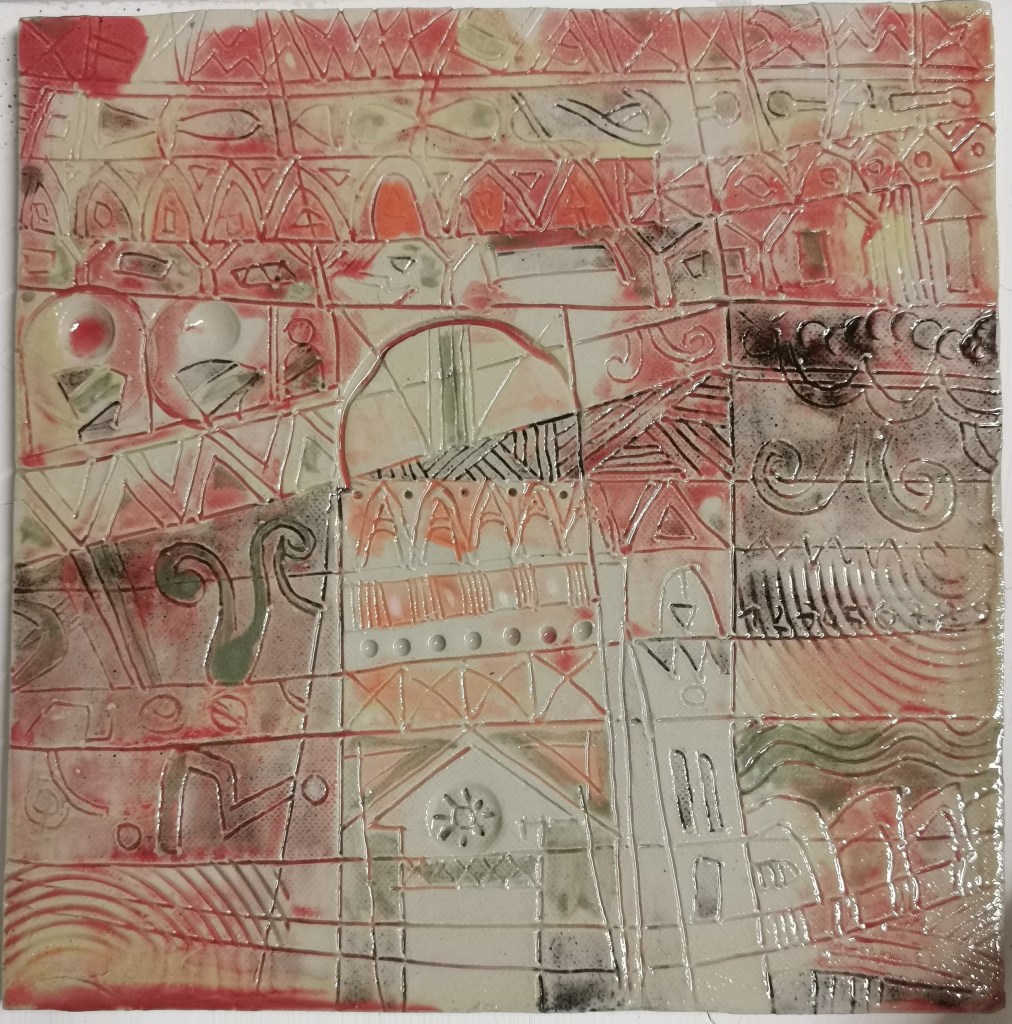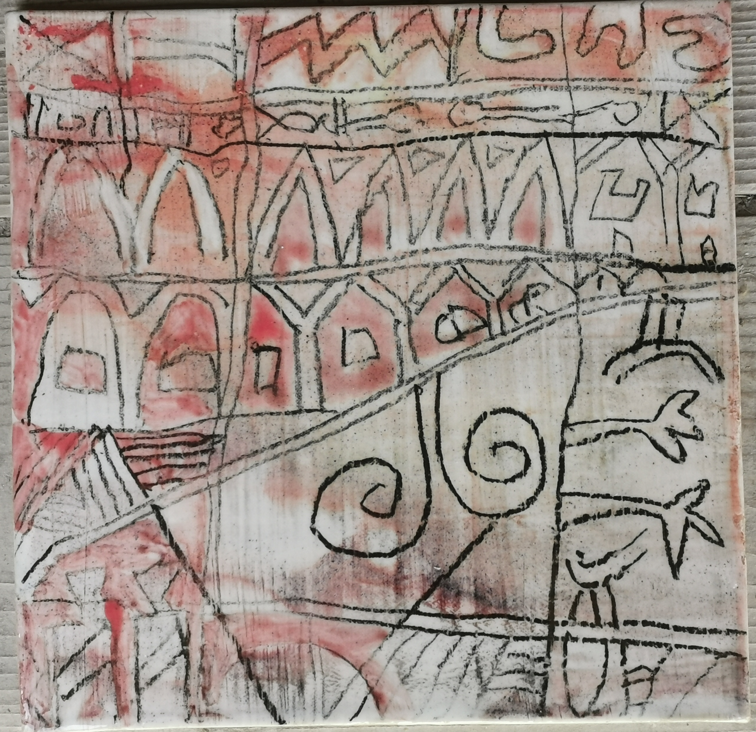 Partendo da lastre 20 x 20 cm sia biscottate che fresche , giocando con incisioni, riserve , matite e una serie di ingobbi più o meno diluiti .